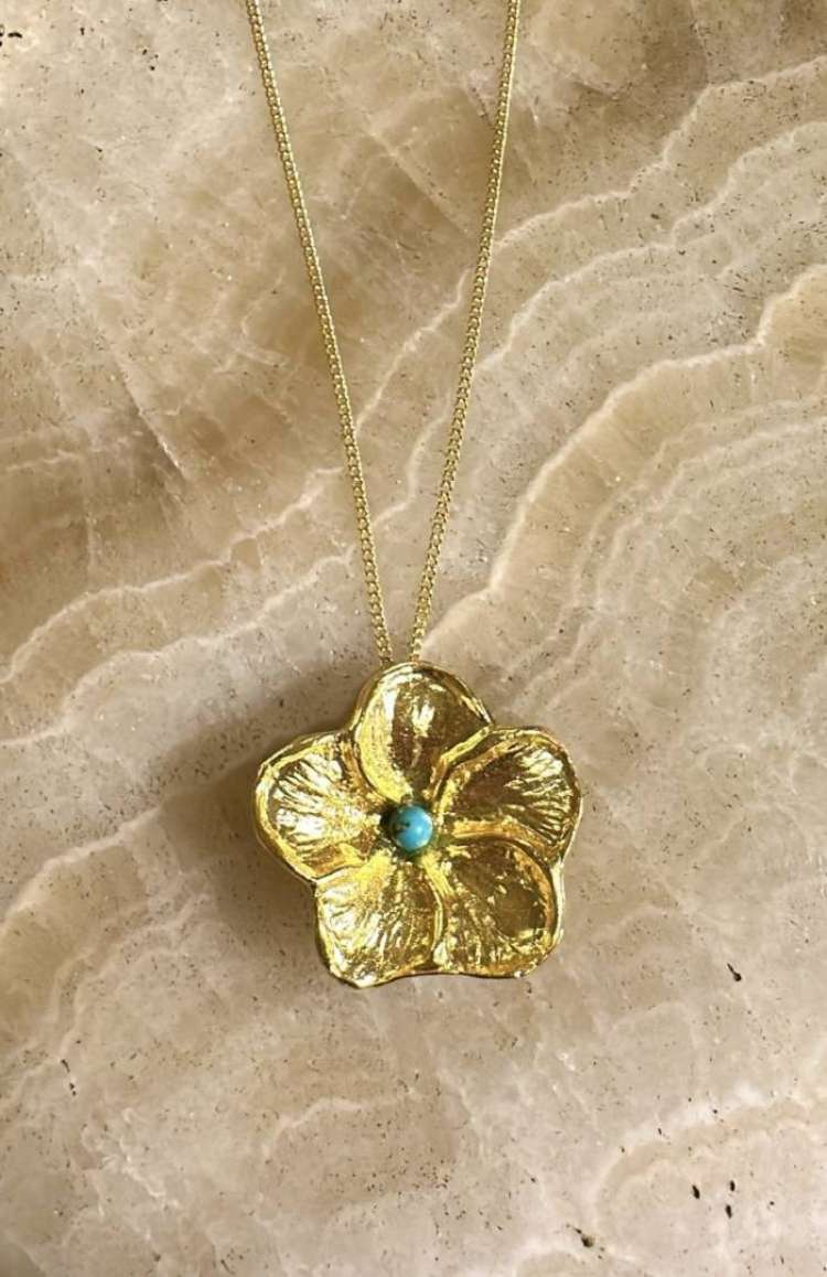 Bronz üzerine altın kaplama, firuzeli çiçek kolye